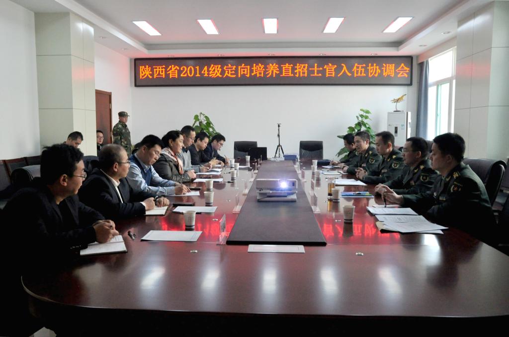 12月8日下午,公司2014级定向培养直招士官入伍协调会在阎良校区召开,公司党委副书记谭少敏,省军区军务动员处处长吕森,西安警备区参谋长王巨礁,阎良区武装部政委周立文,公司人才招聘处、教务处、士官公司负责人参加了本次会议,会议由吕森主持。工作组一行首先实地考察了士官公司的建设情况,详细了解了公司的军营文化宣传、士官生公寓管理等情况,随后参观了公司校史馆、航空馆。