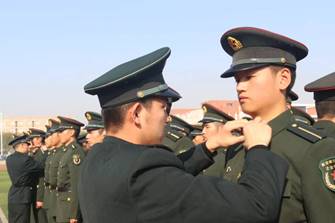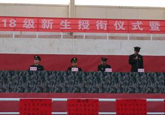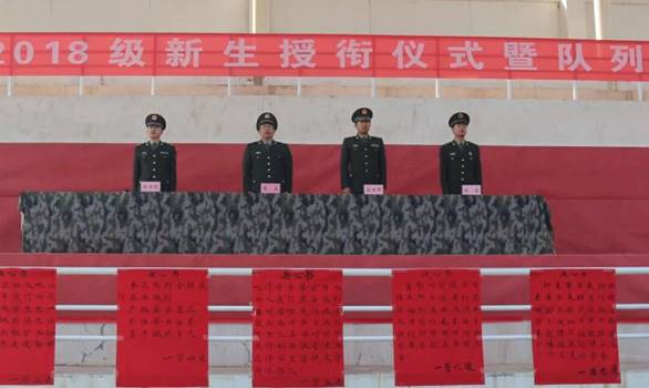 下午两点整,随着九面鲜红的“决心书”拉开活动帷幕,操场充满了“秋风吹、战鼓擂,革命英雄谁怕谁”般的浓烈比拼氛围,雄壮的军歌声响彻云霄,全体师生以最崇敬的军礼迎院旗,大二优秀骨干和入党积极分子为2018届新生授予代表荣誉和责任的神圣军衔,新生营副营长张晓斌带领全体新生进行庄严宣誓,“我志愿加入中国人民解放军……”,坚定的誓言不仅穿透天际,深深地刻在全体新生的心中,整个授衔过程庄严肃穆,此刻,新生们深知自己肩上扛着的不仅仅是服饰标识,更是一份沉甸甸的责任和使命,新生畅驰同学代表全体2018届士官生表决心,更加坚定了同学们在以后的学习训练中奋勇争先、斩获佳绩的信心和决心。