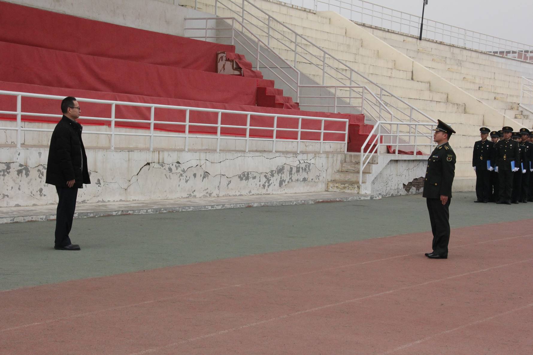 随着各连长洪亮口号,各连在连长的带领下,迈着整齐的步伐走进会场。督察队在副队长王善乐的带领下在主席台侧面集合待命。本次检查方式为各连依次带到受检区,督查着重对同学们的着装佩饰、发型、指甲、袜子、内外腰带等进行了全面细致的检查。本次检查中,全体士官新生军容严整,姿态端正,精神抖擞。检查过程中虽有烈烈寒风,但步伐依旧整齐,口号依旧嘹亮,军装依旧笔挺。充分展现出士官生的良好精神风貌。检查中所发现的问题,督查一一作了记录,对个人量化考核分进行了相应扣除。最后,赵书记宣布检查结束,各连按照编制有序退场。检查圆满结束。