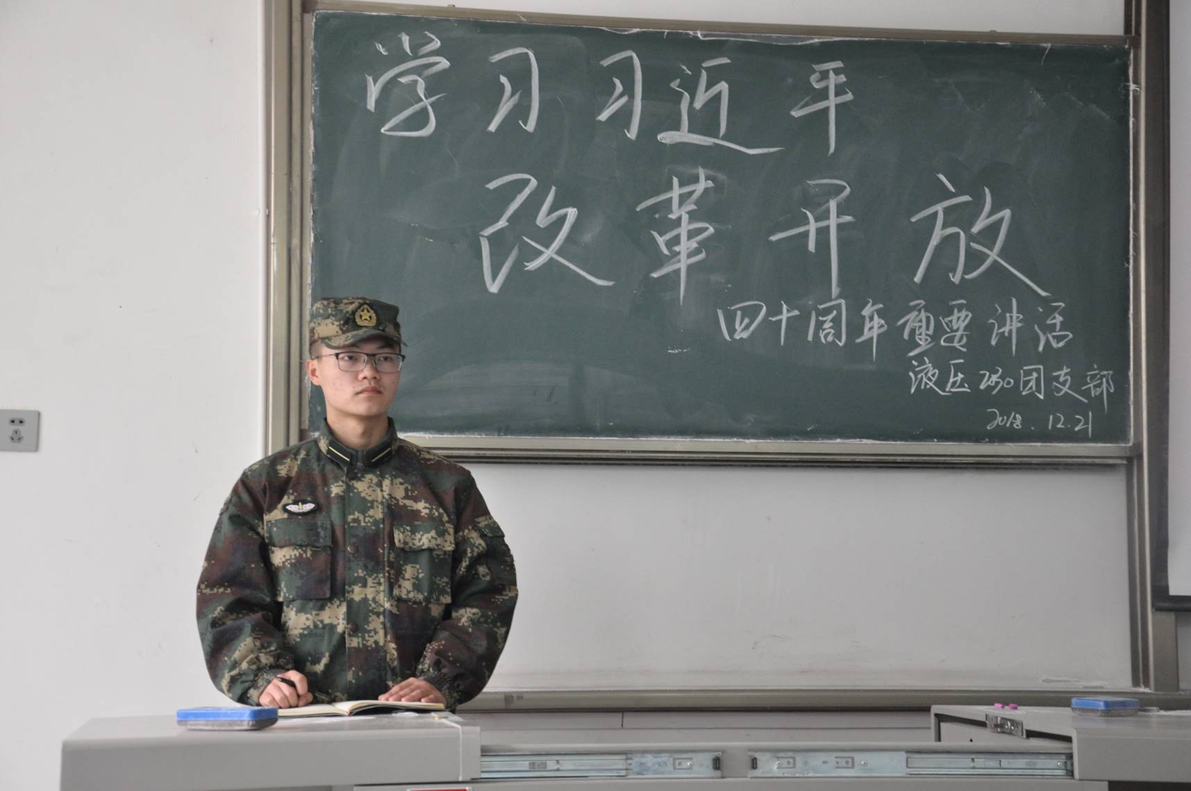 通过此次对“习近平总书记在庆祝改革开放四十周年大会上的重要讲话精神”的学习,同学们都感慨万千。改革开放永远在路上,我们新一代革命军人要抓住历史机遇,把敢闯、敢冒、干事、改革的改革精神一代一代传承下去,发扬光大,创造更大的奇迹。早日实现中华民族伟大复兴的伟业。