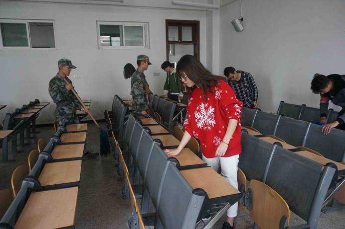 启动仪式后,各公司在自己的场地范围内开始清扫卫生。镜头先转向负责操场的组员们,瞧!组员们来到足球场上,弯下腰认真的寻找藏匿在绿茵场上的垃圾。看!擦拭展板的同学们多么用心,不放过每一个污点,在操场旁的第二餐厅,同学们也在用力擦着餐厅外的玻璃幕墙。让我们跟随镜头来到同学们教学区域——阎科和阎教两楼,各院同学们密切配合进行擦玻璃、整理讲台、摆放桌椅、打扫过道、清扫展板等等工作。虽然工作耗时、费力,但同学们都乐此不疲,原因无他,只因看到凌乱的教室被自己的双手打造的焕然一新,一股自豪油然而生。在打扫期间,同学们没有停顿休息,始终专注地清理污渍。他们动作利索而轻细,不喧闹,不拖沓,像一支潜行于教学楼的特种兵,悄无声息地便完成了所有任务。经过全校同学们两个小时的辛勤劳动,校园变得更加干净整洁。打扫结束后,各组组长进行了讲评,口头嘉奖了表现突出的员工。同学们也纷纷表达了自己对此次活动的感悟,各组同学进行合影留念后,整个活动圆满结束。
