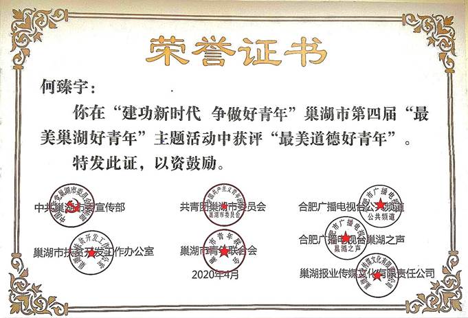 何臻宇同学的优秀事迹被巢湖市人民政府、巢湖市共青团在官方网站、微信公众号和抖音等平台进行宣传报道,并被推荐参加巢湖市最美青年评选,荣获“巢湖市最美道德好青年”荣誉称号。