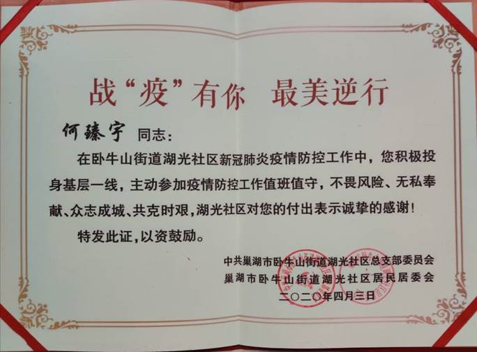 士官公司2019级电气自动化技术专业192D班何臻宇同学,于2020年1月至4月,积极参加安徽省巢湖市卧牛山街道湖光社区疫情防控志愿服务活动,帮助社区开展疫情知识宣传、公共场所消毒、一线值班检测等工作,被社区评为“战疫有你、最美逆行”优秀志愿者,充分体现了士官生在疫情防控工作中积极主动、不畏风险的责任意识,树立了准军人在人民群众生命安全面前无私奉献、敢于担当的良好形象。