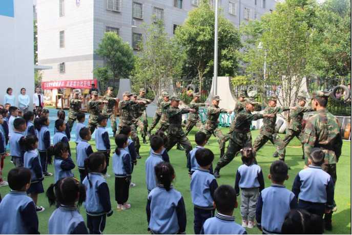 在升旗仪式结束后,士官生进行了一次拳术表演表演示。士官生气势磅礴,敏捷精准的军体拳赢得了满堂喝彩。直观地向师生们展示了“雄赳赳,气昂昂”的士官生风采,军人的气概、军人的灵魂播进这些朝气蓬勃的小员工心中。