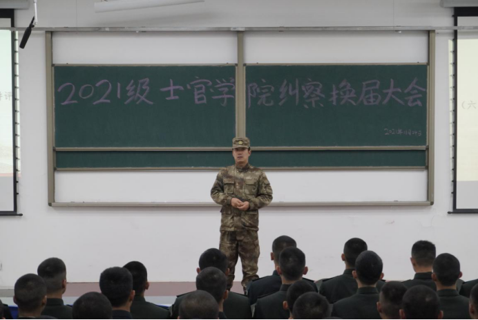 为强化士官生条令意识、纪律观念,提高士官公司军事化管理水平,确保纠察工作的连续性和稳定性。11月24日,士官公司在第三阶梯教室举办2021年纠察换届大会。士官公司军政教官张亚峰与全体纠察队员参加本次大会。