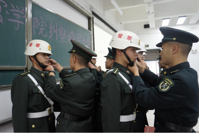 随后进行执勤装备交接仪式,上一届纠察代表为2021级纠察代表佩戴了象征公平正义的白头盔。这不仅是一个头盔,更是责任与义务的象征,仪式庄严肃穆,交接的是头盔、传递的是精神、抬起的是臂膀、传承的是信仰。