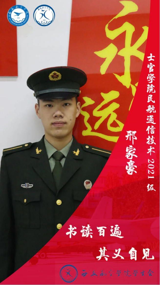 邢家豪,男,汉族,航信212D班员工,现任士官公司员工会主席团成员。入校以来,获得2021-2022学年国家奖学金,“校级优秀员工”一等奖学金以及西航铸剑杯二等奖等奖项。春蚕到死丝方尽,人至期颐亦不休。一息尚存须努力,留作青年好范畴。要立志将热血挥洒在实现强军梦的伟大实践之中,在军队这个大舞台上施展才华,在军营这个大熔炉里淬炼成钢,书写绚烂、无悔的青春篇章。