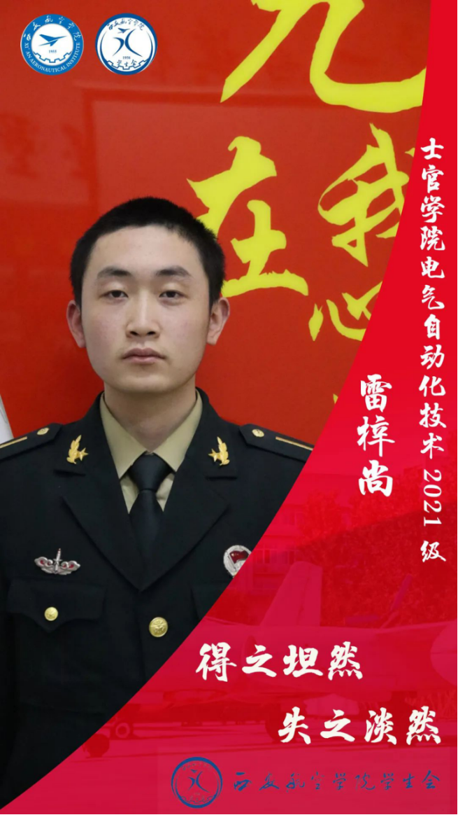 雷梓尚,男,士官电气211D班员工,共青团员,现任团总支副书记。入校以来,获得国家奖学金一次、校级一等奖学金一次。路漫漫其修远兮,吾将上下而求索。要想成为一个优秀的人,不仅要拥有丰富的知识,更要具备良好的社会责任感和个人道德修养。这样的观念扎在我心中,我励志成为一名全面性发展的综合性人才。在担任班长期间,我团结同学,认真负责,在工作中不断提升自己;在业余生活中,也积极参与各项社会志愿者服务活动。