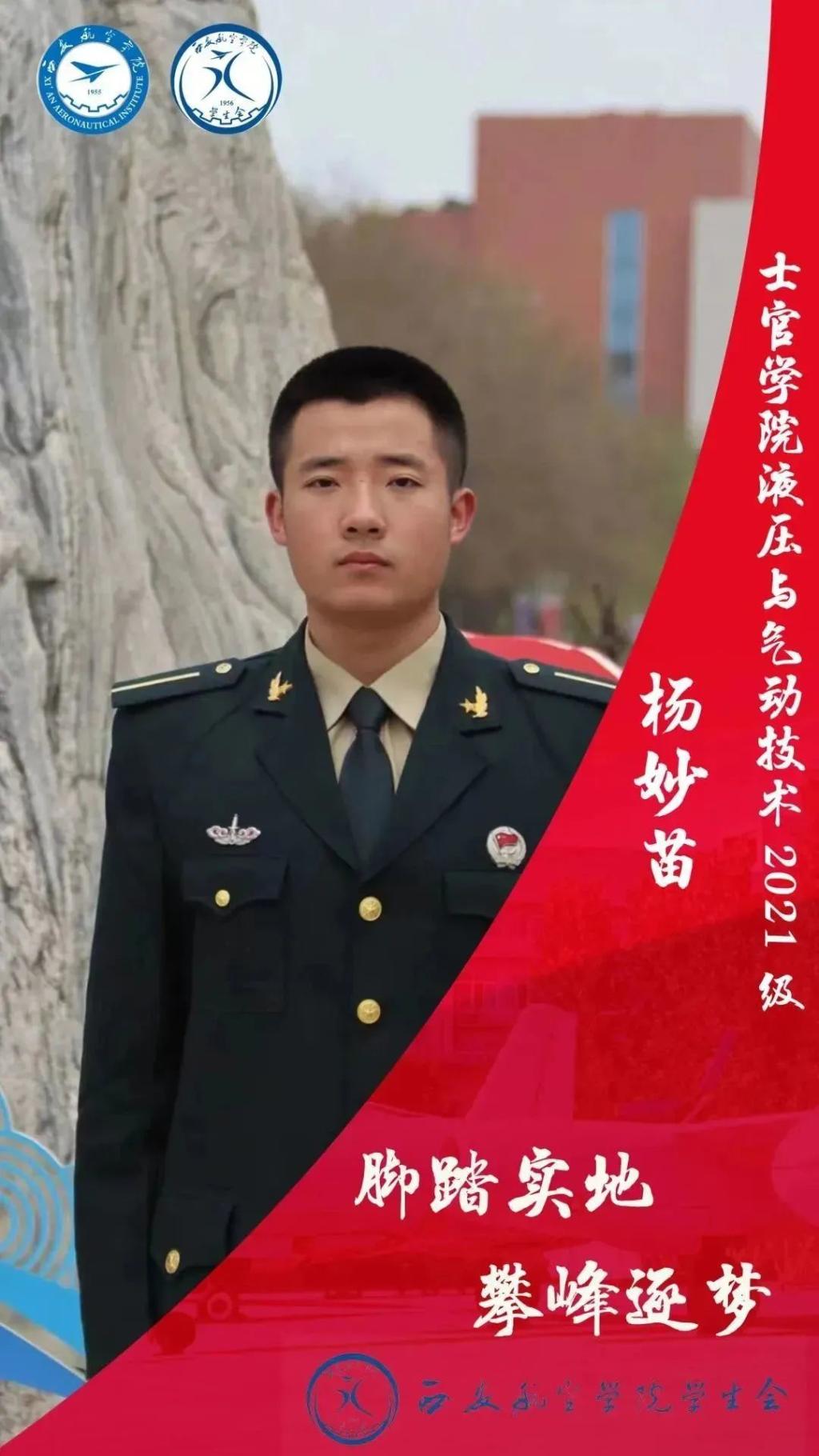 杨妙苗,男,共青团员,液压214D班。现担任班长。在校期间,个人在校表现出色,工作态度认真,并且耐心十足,积极配合公司工作,紧抓队列训练,并出色完成各项任务。在校期间,获得军训“优秀学员”称号,参与2022年士官公司暑期三下乡“寻找老兵,宣扬红色精神”社会实践活动。荣获2021-2022学年国家励志奖学金。