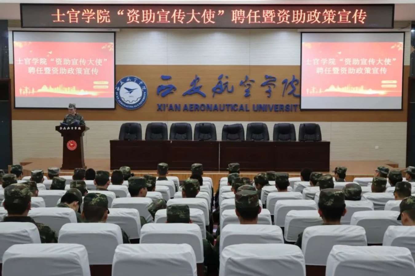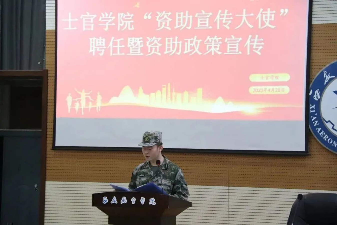 为培养员工自立自强、开拓进取良好品质,以激发员工内生动力为目标,4月20日晚上8点士官公司在阶梯一教室举办“资助宣传大使”聘任仪式即资助政策宣讲大会。出席本次会议的有士官公司员工管理科科长来东老师,2021、2022级军士学员代表参加了此次活动。