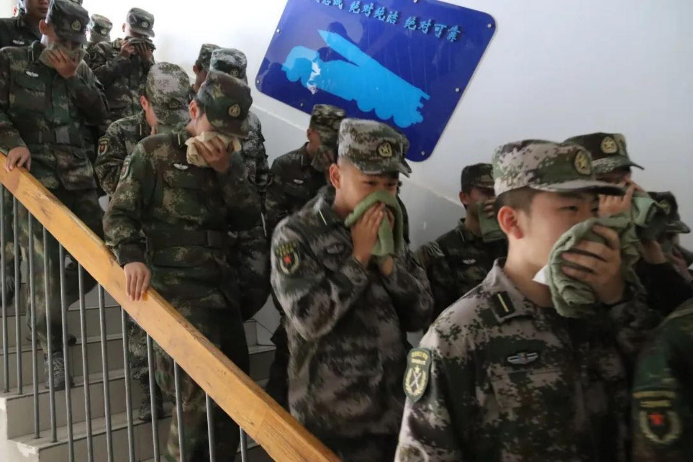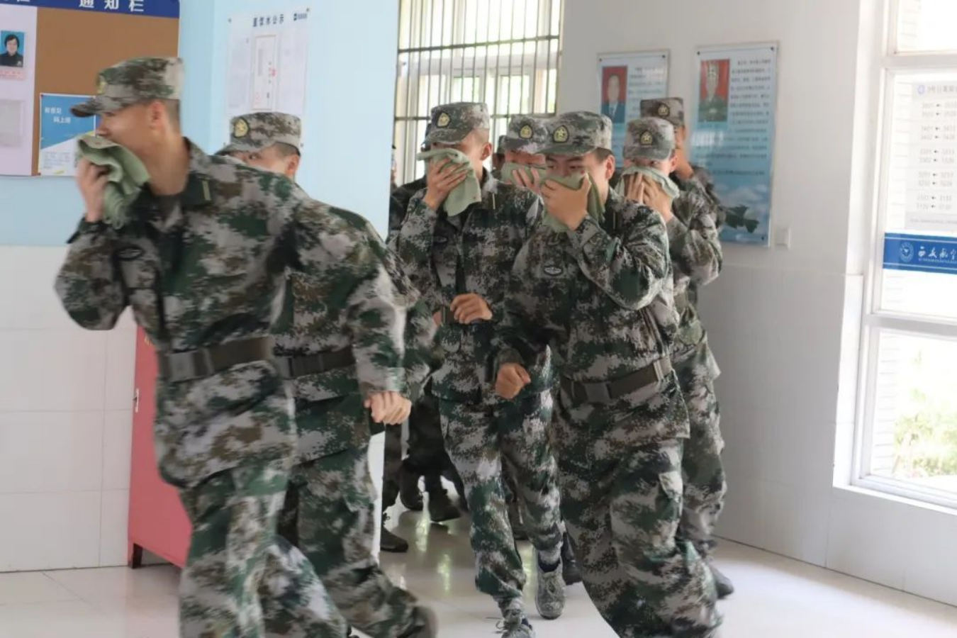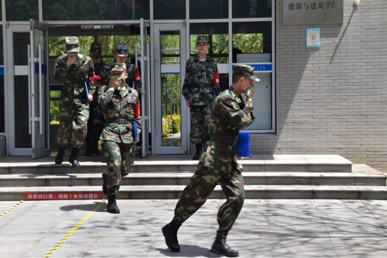 演练共分为险情发生、安全撤离和紧急集合。本次消防演习的突发进行,能更好地考验学员的应急自救能力。疏散过程中,学员们听从指挥,保持冷静,用湿毛巾捂住口鼻并降低身体高度,靠墙沿楼梯右侧撤离,展现出军士学员训练有素的精神风貌,彰显了学员们临危不乱的坚毅品质。