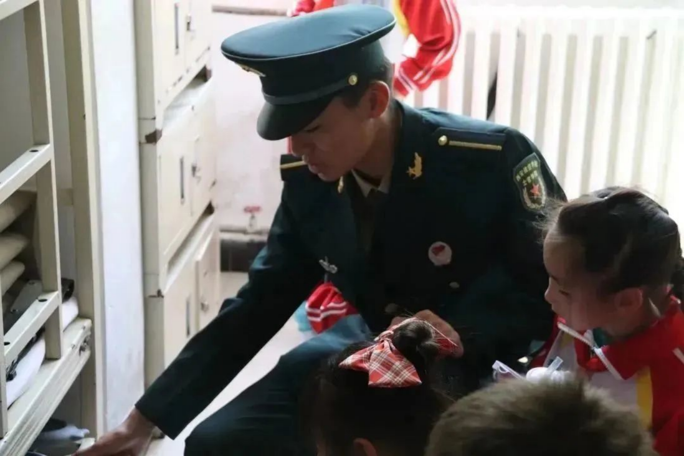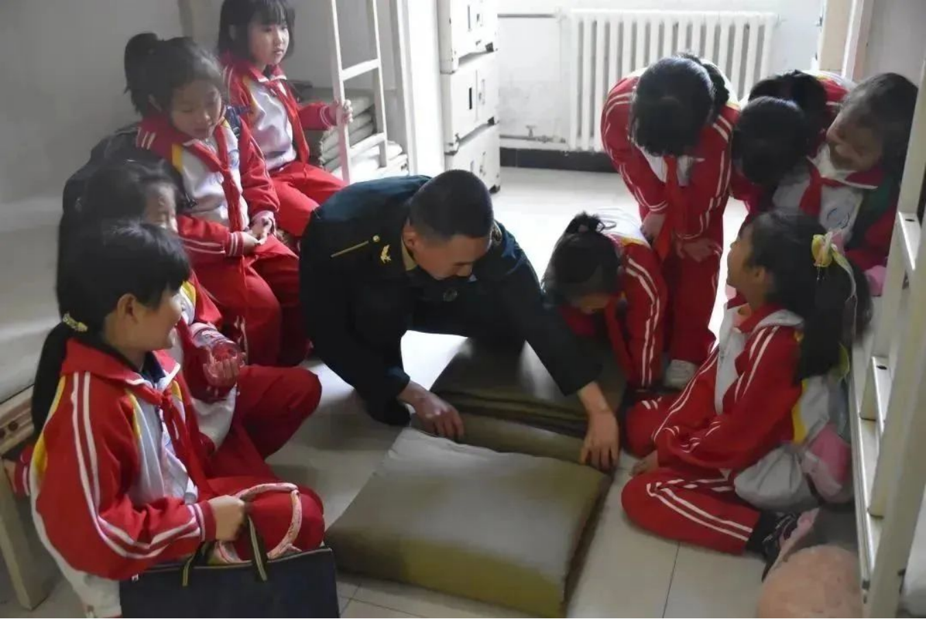 航空一小的孩子们怀揣着满心的好奇进入学员们的宿舍,看着学员们方方正正、棱角分明的“豆腐块”,整齐划一的鞋架、线条清晰的毛巾......整齐规划的内务引来孩子们的赞叹。