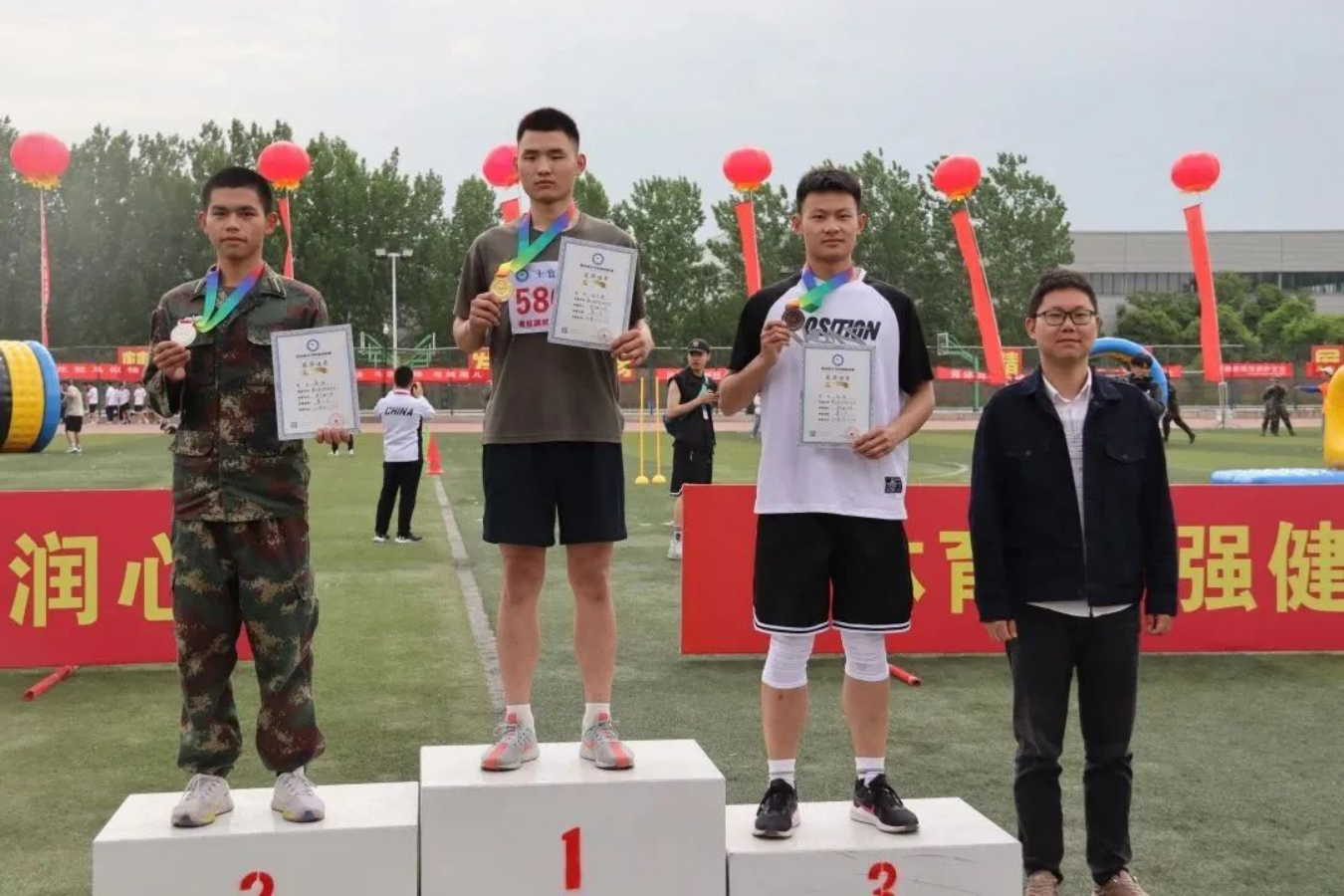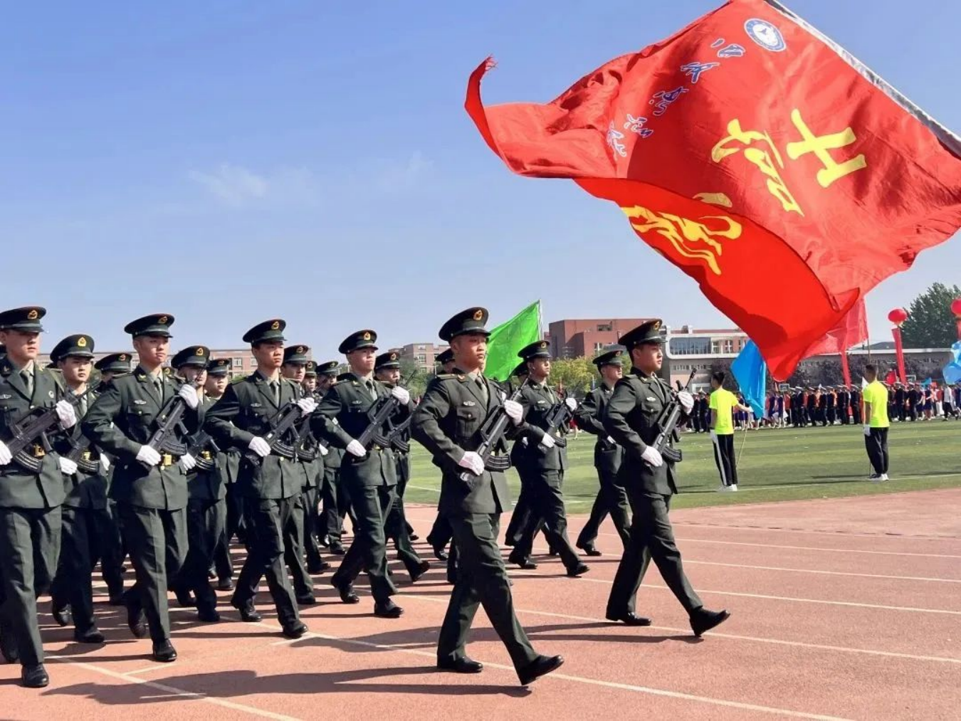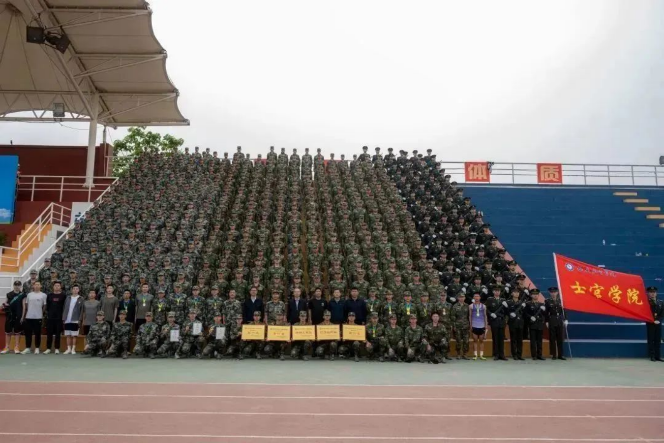 运动场上取得的成绩,是对我们平时刻苦训练成果的检验,今天的挥洒汗水苦练,是为了将来在真正的军营一飞冲天。军士学员的信条:有第一必争,有荣誉必夺,有困难必克。祖国需要——我在!祖国强大——有我!