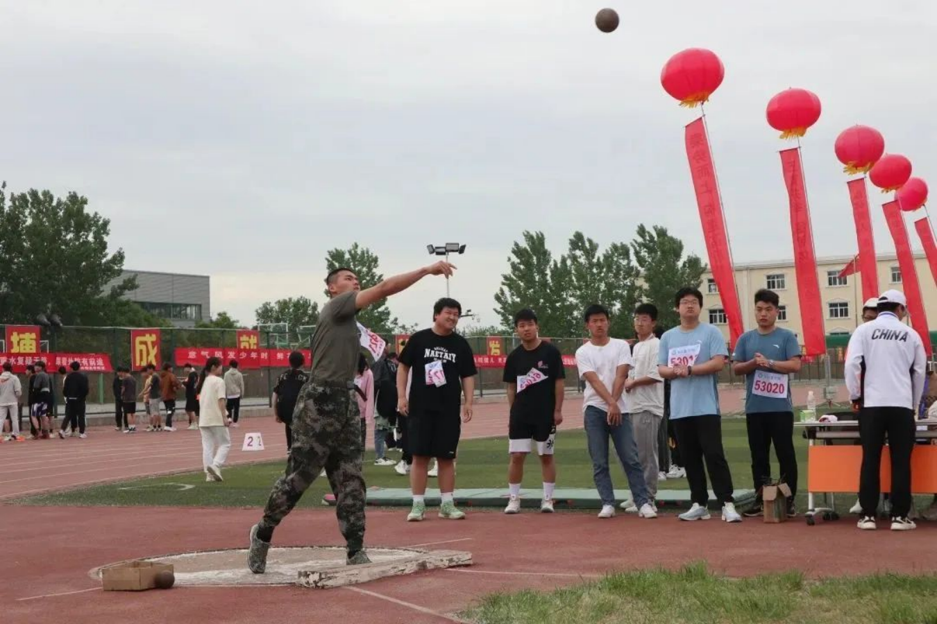 一次次奋力地投掷,一道道美丽的弧线,这是你们努力的结果,是力与美的共存。完美动作,完美弧线,完美落地,运动的美在军士健儿身上体现。高扬奋斗之帆,焕发昂扬斗志。