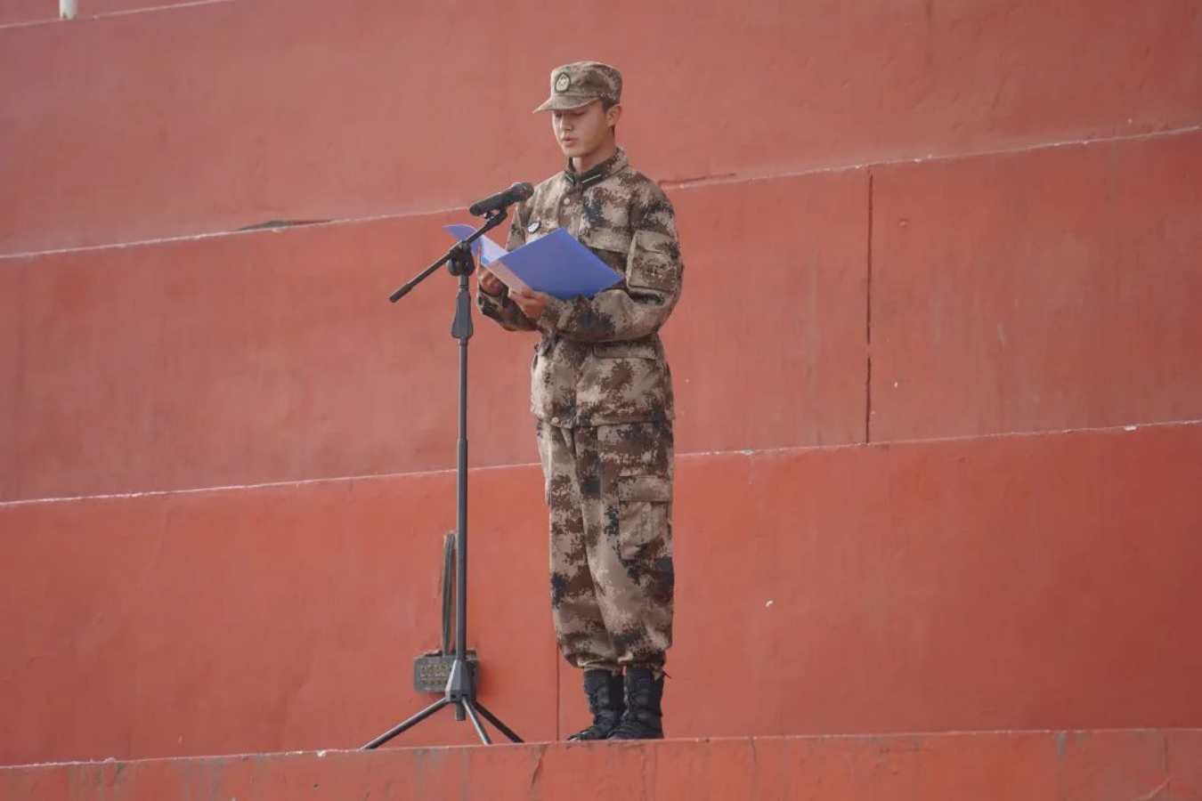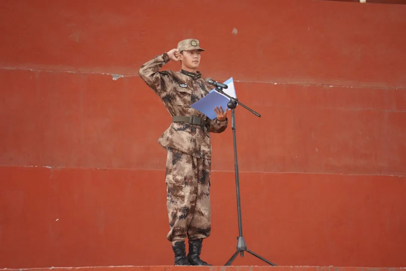 仪式第六项,张亚峰对新学员目前阶段训练工作进行总结,对新学员们的队列表现感到欣慰,并对先进队伍提出表扬,同时也指出队列中存在的不足,强调出优秀的单个军人队列动作是一名合格军士学员不可或缺的素养。