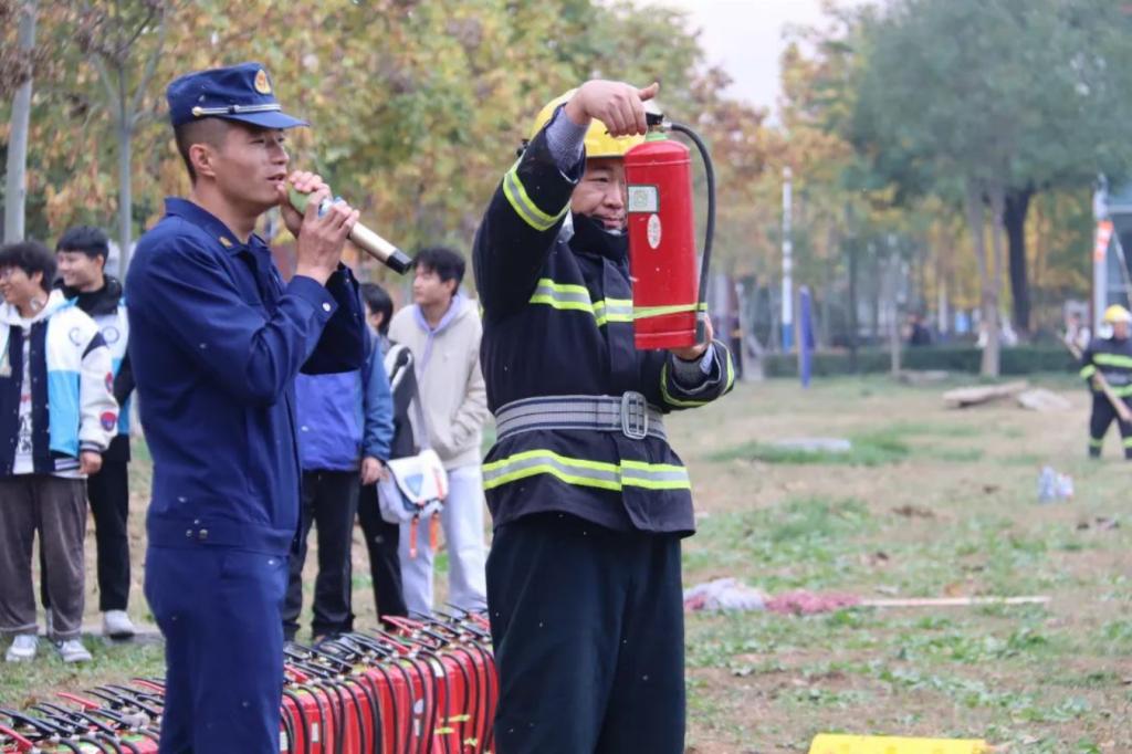 下午一点,随着警报声响起,学员们在安全员的引导下用湿毛巾捂住口鼻,按照宿舍楼消防应急疏散预案路线,迅速有序地撤离到“安全地带”。到达指定位置后,各班指挥员立刻清点人数,确保所有人员安全脱离危险区域。接着,消防员向在场师生介绍了灭火器的正确操作步骤和使用方法,展示了一般性火灾的施救措施,随后由在场师生及志愿者陆续操作灭火器进行现场模拟灭火演练。