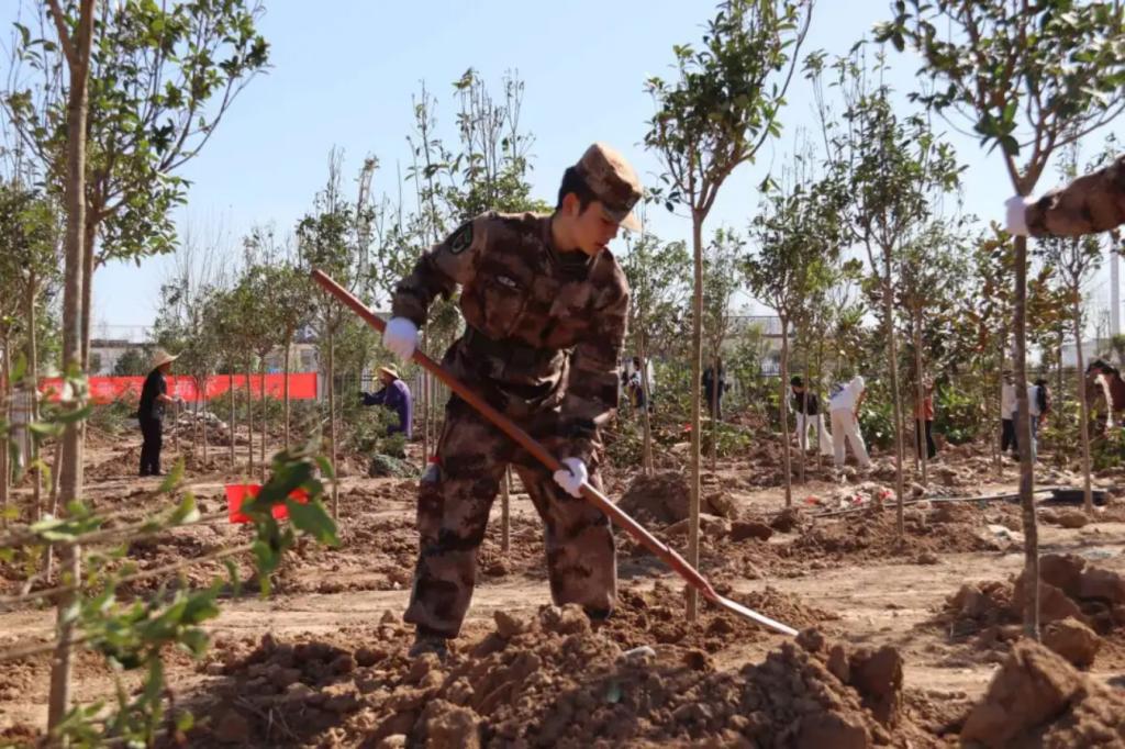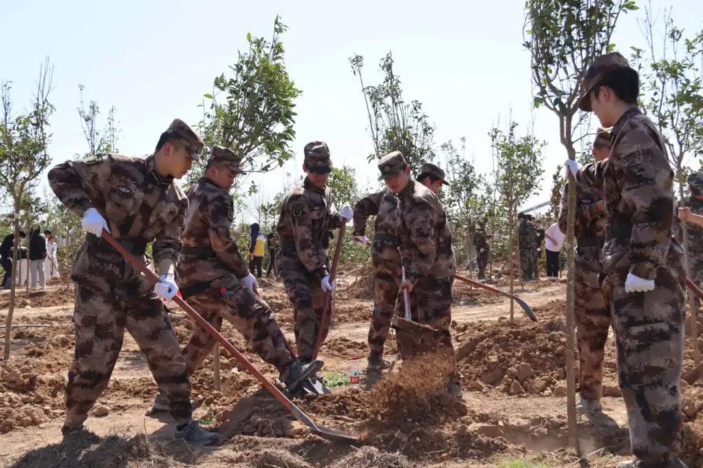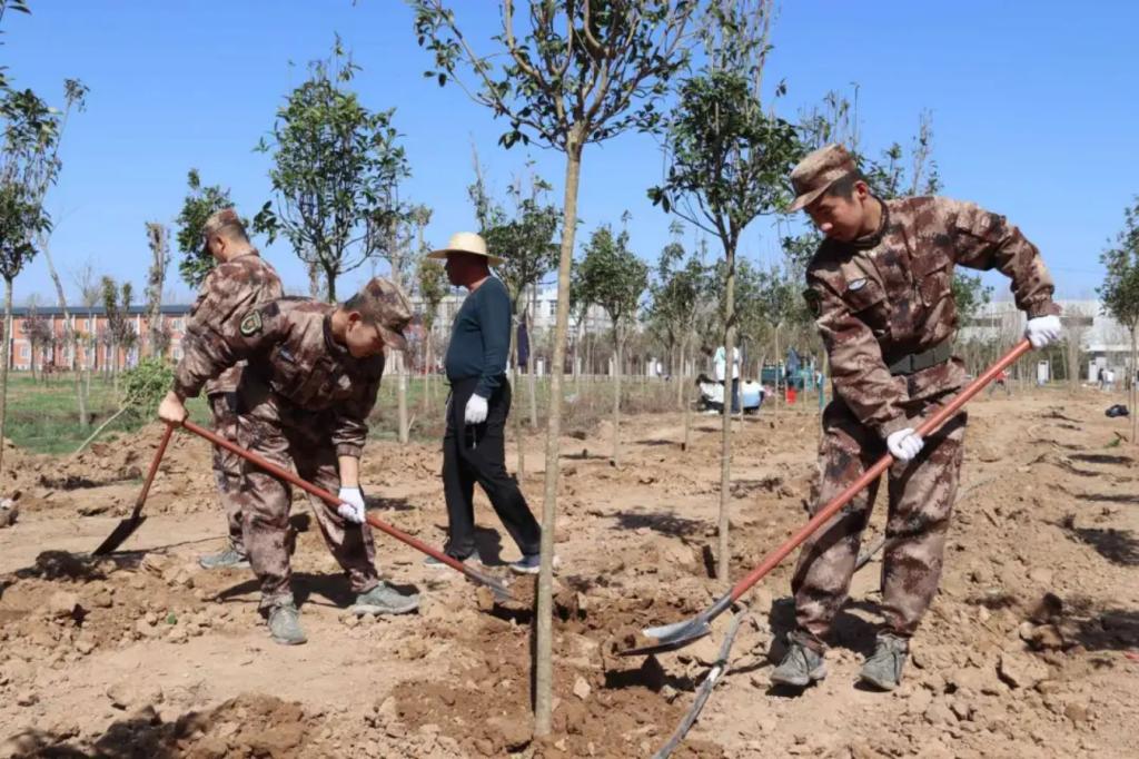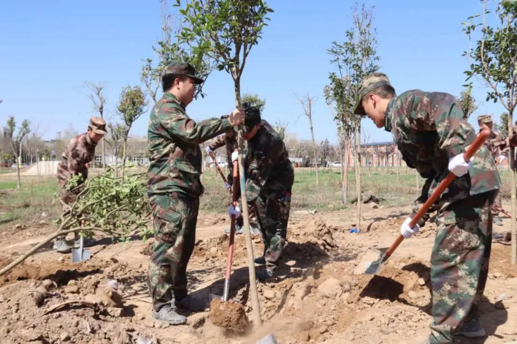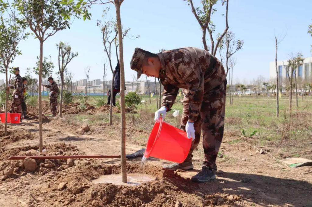本次活动中,学员们身着迷彩,手持铁锹、水桶等工具,精神饱满地投入到植树活动中。他们挥汗如雨,挖坑、栽种、培土、浇水,每一个环节都一丝不苟,他们以严谨有序的纪律和不屈不挠的意志,精心栽种每一棵蕴含生命力的树苗。每一滴挥洒的汗水,都浸润着对大地的挚爱;每一道挺拔的身影,都诠释着学员们的责任与担当;每一棵矗立起来的小树,都是对自然的敬畏,对蓝天白云的敬仰,对美好未来的期待。