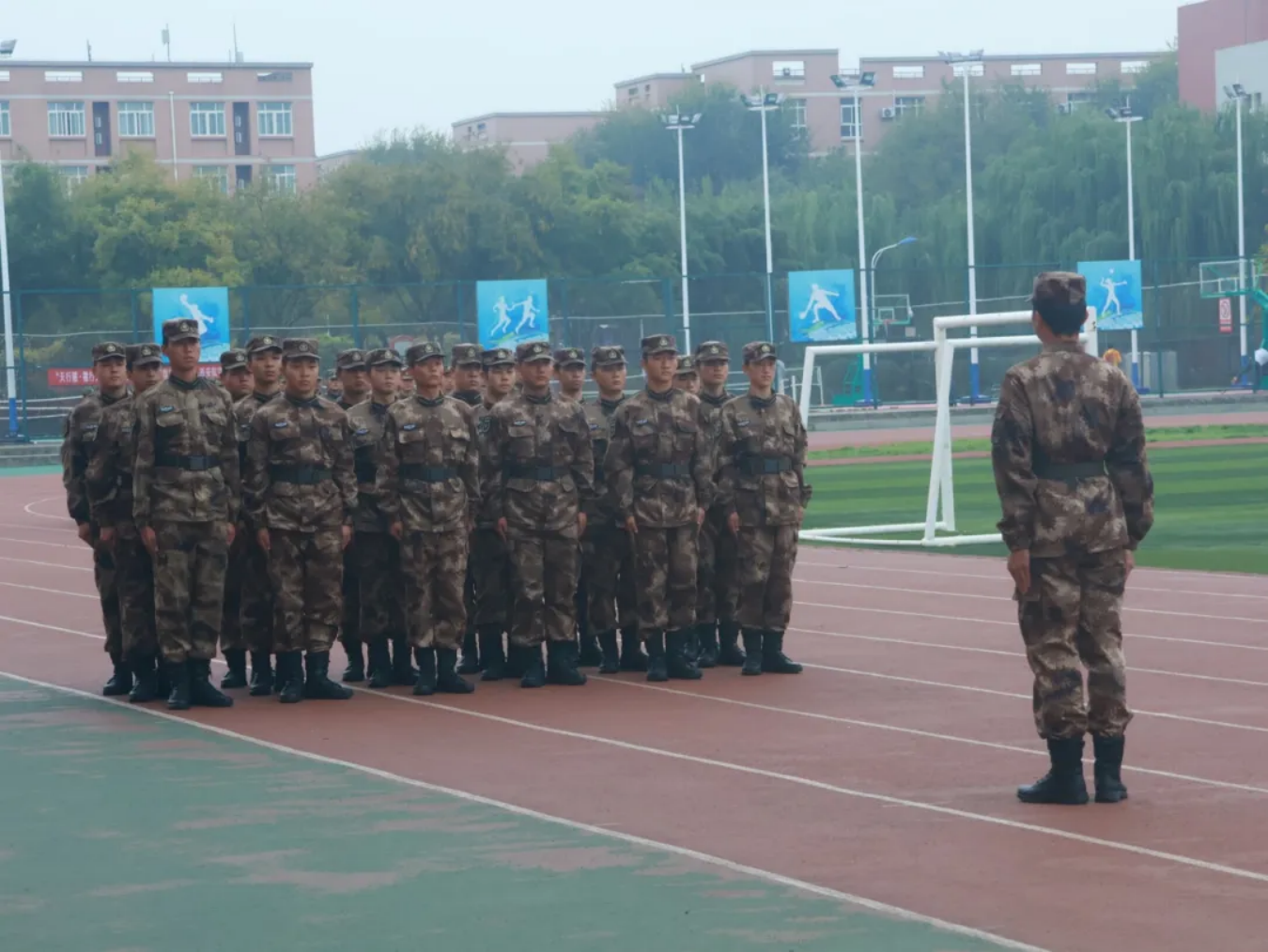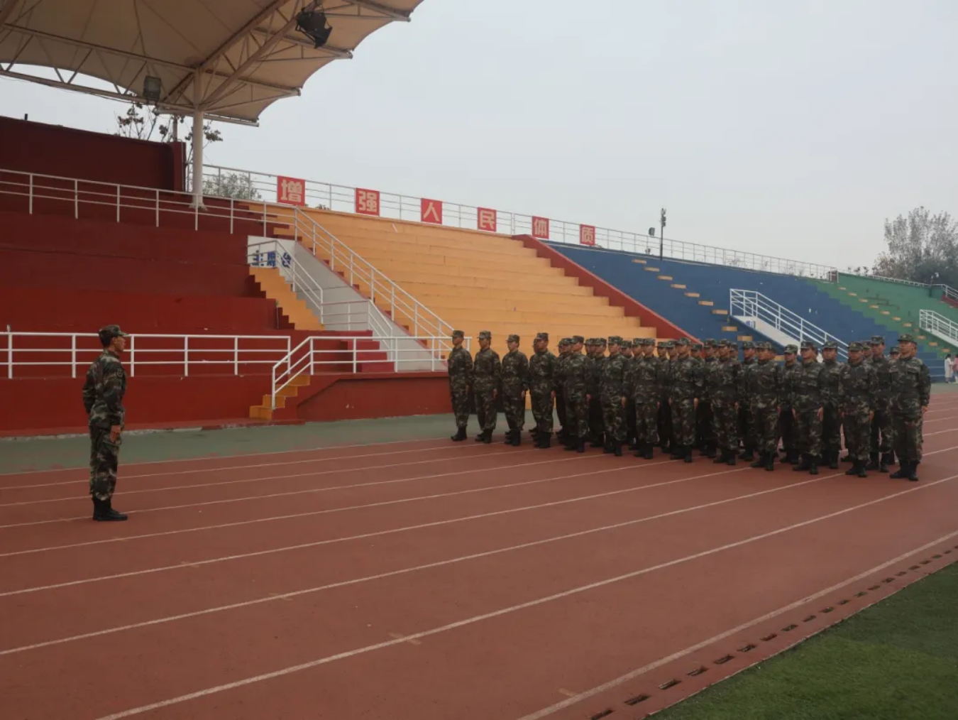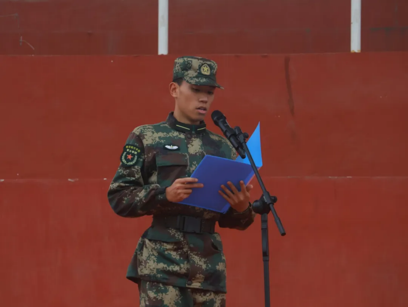 仪式第六项,全职教官张亚峰对新生前阶段的训练进行了总结讲评,肯定了训练成果,特别表扬了进步明显的新生学员,铿锵有力的声音中对学员们充满了信心。