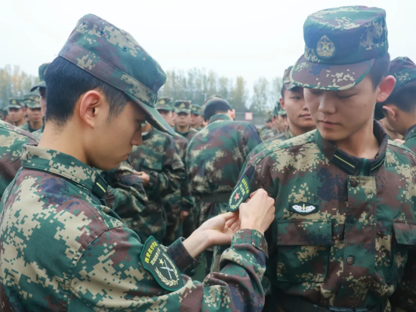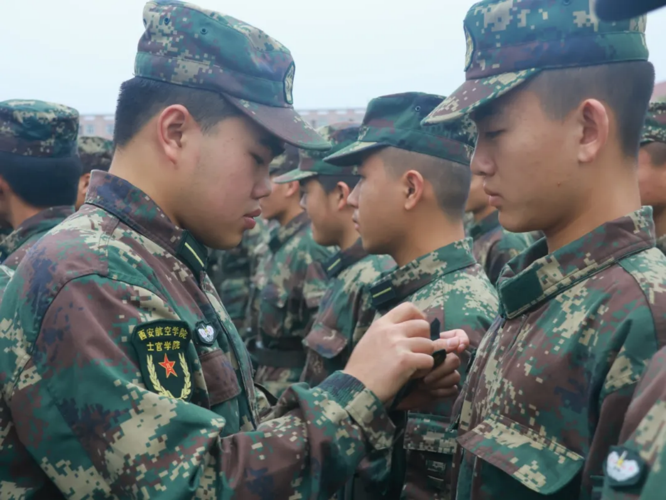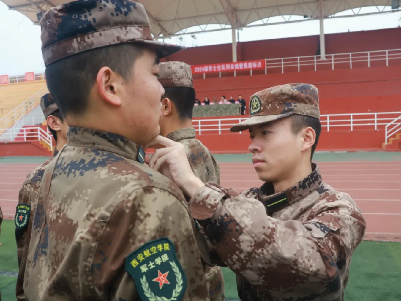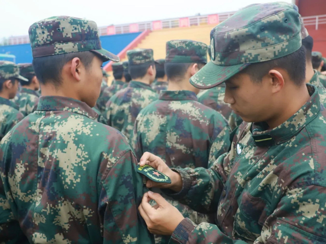 仪式第二项,由best365中国官方网站入党积极分子为新学员佩戴标识。学员们佩戴的不仅仅是一个标识,而是努力的见证,见证了两个月的刻苦训练,同时也将见证学员们的未来与成长,肩负起属于他们的责任与使命。