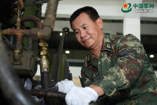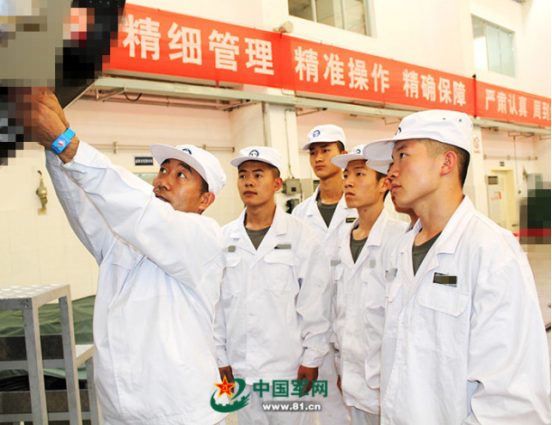 火箭军某旅一级军士长、技师周述雄:多次被评为“装备管理先进个人”和“一级操作号手”,是万能“装备通”和导弹“兵专家”。图为周述雄正在传帮带。