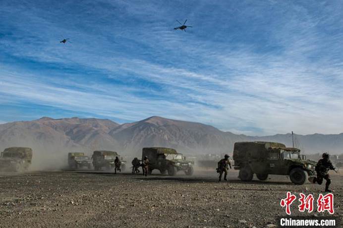 中新网拉萨1月4日电(何蓬磊 马晓明 刘冲)高原上数十辆猛士突击车开足马力在沙石路面驰骋,空中直升机超低空飞行掩护车队突击,伴随着刹车的摩擦声,特战队员跳下突击车,迅速展开战斗队形....电影里的画面正一幕幕在雪域高原现场呈现,而这里正是高原特战队员2020年度首个训练日现场。