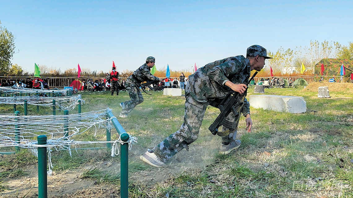 提起仿真枪跃出战壕,匍匐前进穿越铁丝网;戴上防毒面具、穿起防护服,快速通过“染毒区域”……随着防空警报声骤然响起,硝烟弥漫中,一队队青年员工像战士一样,连贯而熟练地完成疏散掩蔽、战伤救护、伤员转移等课目动作。